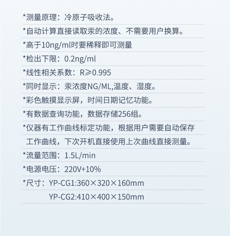 2.自動計(jì)算直接讀取汞的濃度、不需要用戶換算。