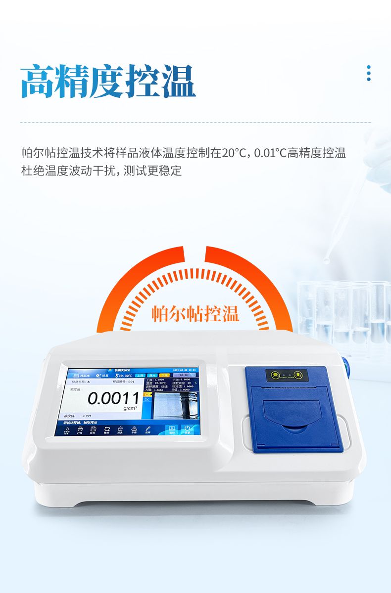恒溫電子式液體密度計是通過結合帕爾帖控溫技術將樣品液體溫度控制在20℃,再由電磁引發U型管震蕩,通過震蕩頻率測算出樣品液體的密度。能夠測試大部分液體(高粘度以及氟化氫等會腐蝕玻璃的除外),正以實用、可靠、準確率高、測量精度高等優點,廣泛應用于飲料食品、石油化工、檢驗檢疫、計量校準等分析領域里。
