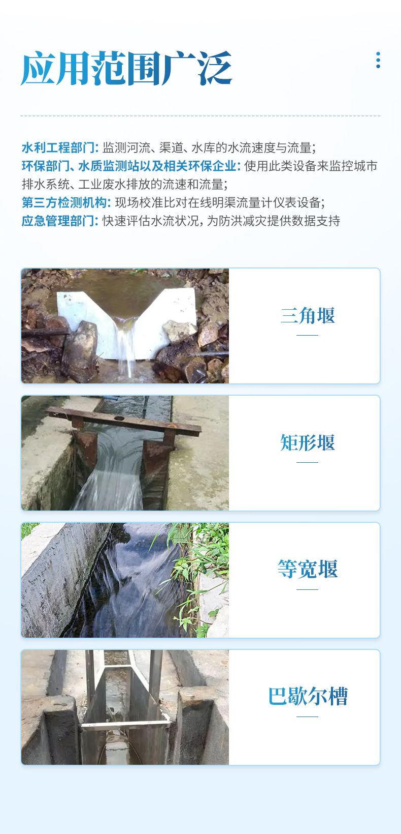 水利工程部門:監測河流、渠道、水庫的水流速度與流量;