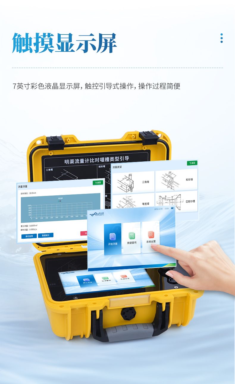 便攜式明渠流量計是專為水文監測、江河流量監測、農業灌溉及市政給排水等行業設計的一種高精度測量儀表,它采用超聲波技術和特殊的微功耗設計方案,結合全數字信號處理技術,確保了測量的穩定性與可靠性。該設備具有廣泛的測量范圍和較高的測量精度,支持實時數據顯示、數據記錄、導出及打印等功能,操作簡便且準確度高,非常適合于需要頻繁移動進行測量的場合。同時,它依據JJG711-1990檢定規程,并參照HJ353-2019、HJ354-2019、HJ355-2019以及HJ15-2019中對流量監測單元的相關要求進行比對驗收,確保了其在水利工程、環境監測、農業灌溉等領域的適用性和準確性。