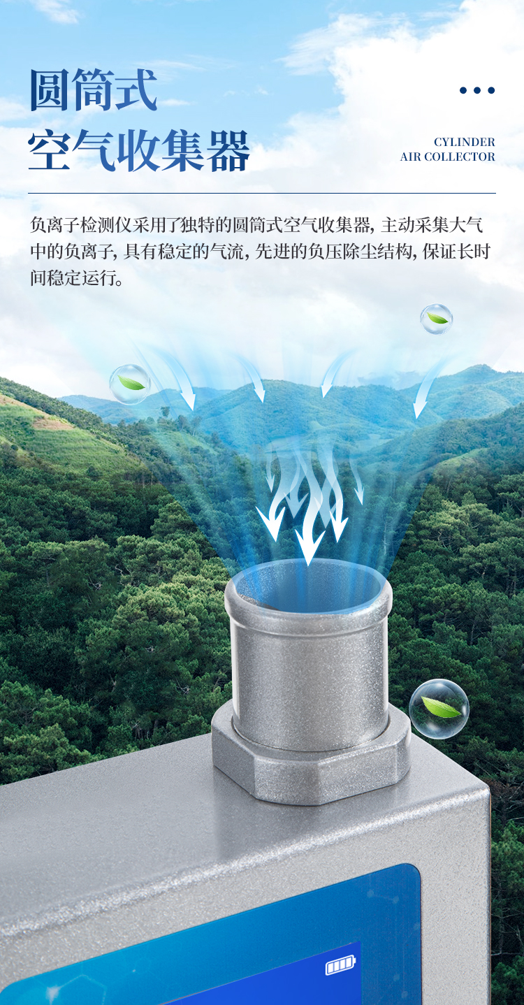 采用“電容式吸入法”原理進行負離子檢測,測量空氣中的負離子濃度值。在離子傳感器(或稱采集桶、采集筒)的極化板(或稱偏壓板)上加載定量的極化電壓,再讓被測空氣按設定速度勻速通過傳感器。空氣中特定的小粒徑負離子在電場的作用下發生偏轉,被采集板所捕獲。采集到的負離子負電荷量經過采集器的處理,即可計算出負離子的電荷濃度值。