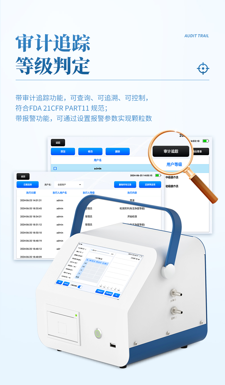 6、帶審計(jì)追蹤功能,可查詢、可追溯、可控制,符合FDA 21CFR PART11規(guī)范
