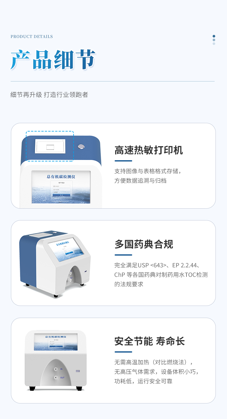 1、檢測制藥工業中純化水、注射用水和高純水中總有機碳的濃度;