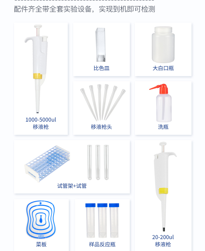 2. 儀器構成:由主機、樣品前處理器具和試劑包等構成,適于現場及實驗室使用