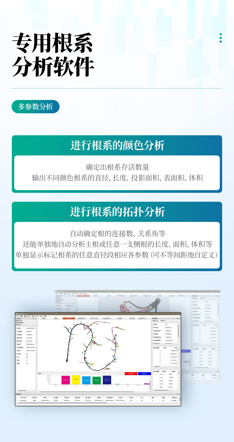 (15)能進行根系的拓撲分析,自動確定根的連接數(shù)、關系角等,還能單獨地自動分析任意一段根的長度、面積、體積等,可單獨顯示標記根系的任意直徑段相應各參數(shù)(可不等間距地自定義)。