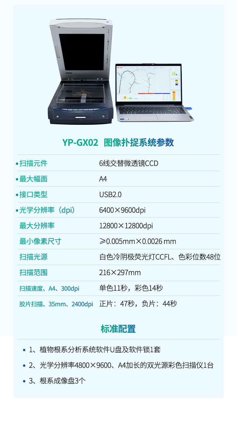 1、配自動對焦的2000萬像素彩色拍攝儀。有效分析幅面最大297mm×210mm。特別適合快速自動分析測量0.5mm直徑以上根系。