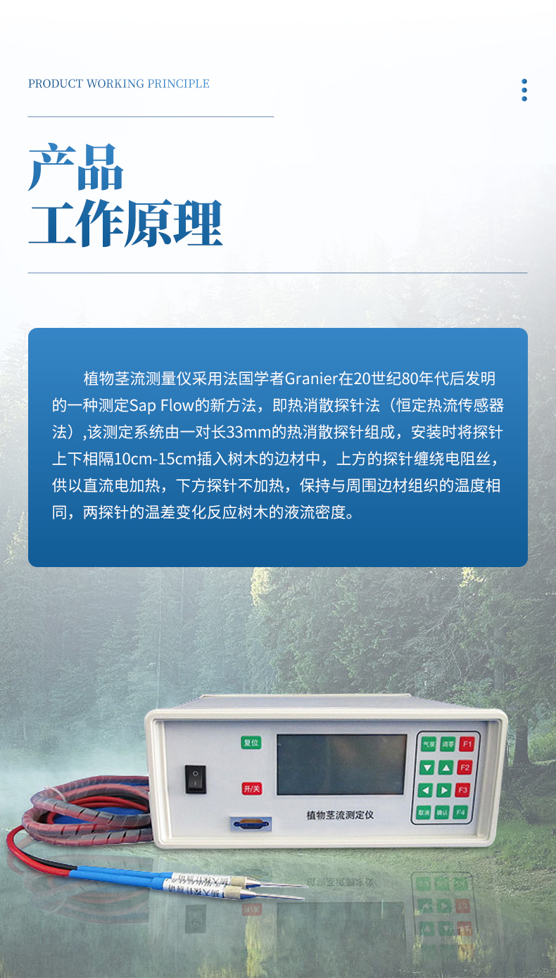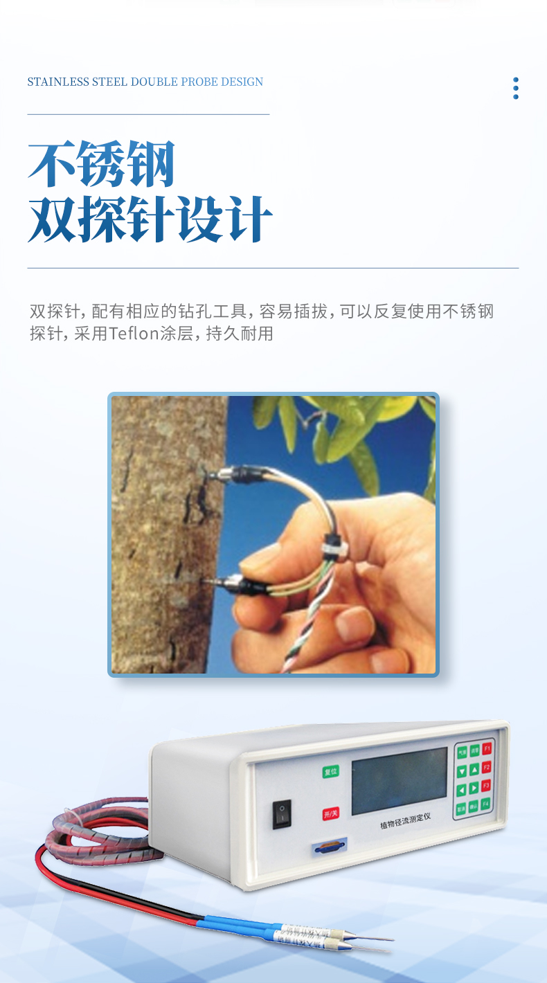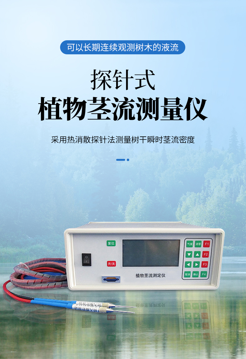 植物莖流測(cè)量?jī)x采用法國(guó)學(xué)者Granier在20世紀(jì)80年代后發(fā)明的一種測(cè)定Sap Flow的新方法,即熱消散探針?lè)ǎê愣崃鱾鞲衅鞣ǎT摲椒ǖ臄?shù)據(jù)采集具有準(zhǔn)確穩(wěn)定的特點(diǎn),而且可以連續(xù)不間斷的讀取數(shù)據(jù),因而數(shù)據(jù)具有系統(tǒng)性。該測(cè) 定系統(tǒng)由一對(duì)長(zhǎng)33mm的熱消散探針組成,安裝時(shí)將探針上下相隔10cm-15cm插入樹木的邊材中,上方的探針纏繞電阻絲,供以直流電加熱,下方探針不 加熱,保持與周圍邊材組織的溫度相同,兩探針的溫差變化反應(yīng)樹木的液流密度。