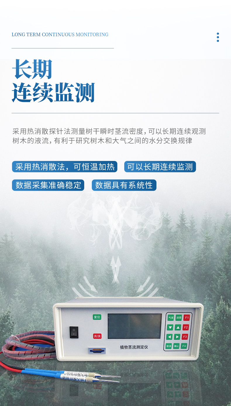 植物莖流測(cè)量?jī)x采用熱消散探針?lè)y(cè)量樹干瞬時(shí)莖流密度,可以長(zhǎng)期連續(xù)觀測(cè)樹木的液流,有利于研究樹木和大氣之間的水分交換規(guī)律,并以此為觀測(cè)手段,長(zhǎng)期監(jiān)測(cè)森林生態(tài)系統(tǒng)對(duì)環(huán)境變化的影響。對(duì)于造林綠化、森林管理和林業(yè)管理等具有重要的理論指導(dǎo)意義和應(yīng)用價(jià)值。