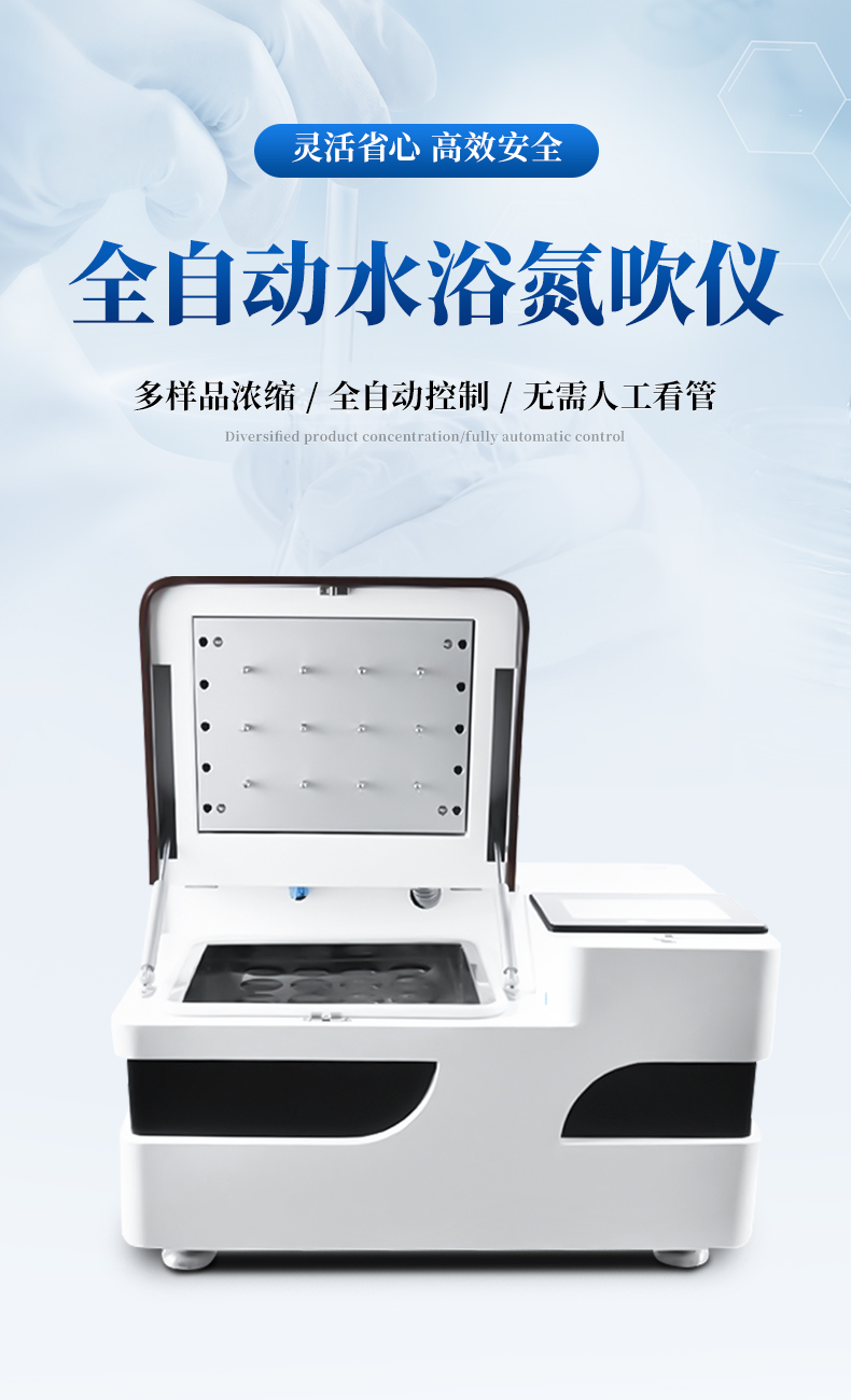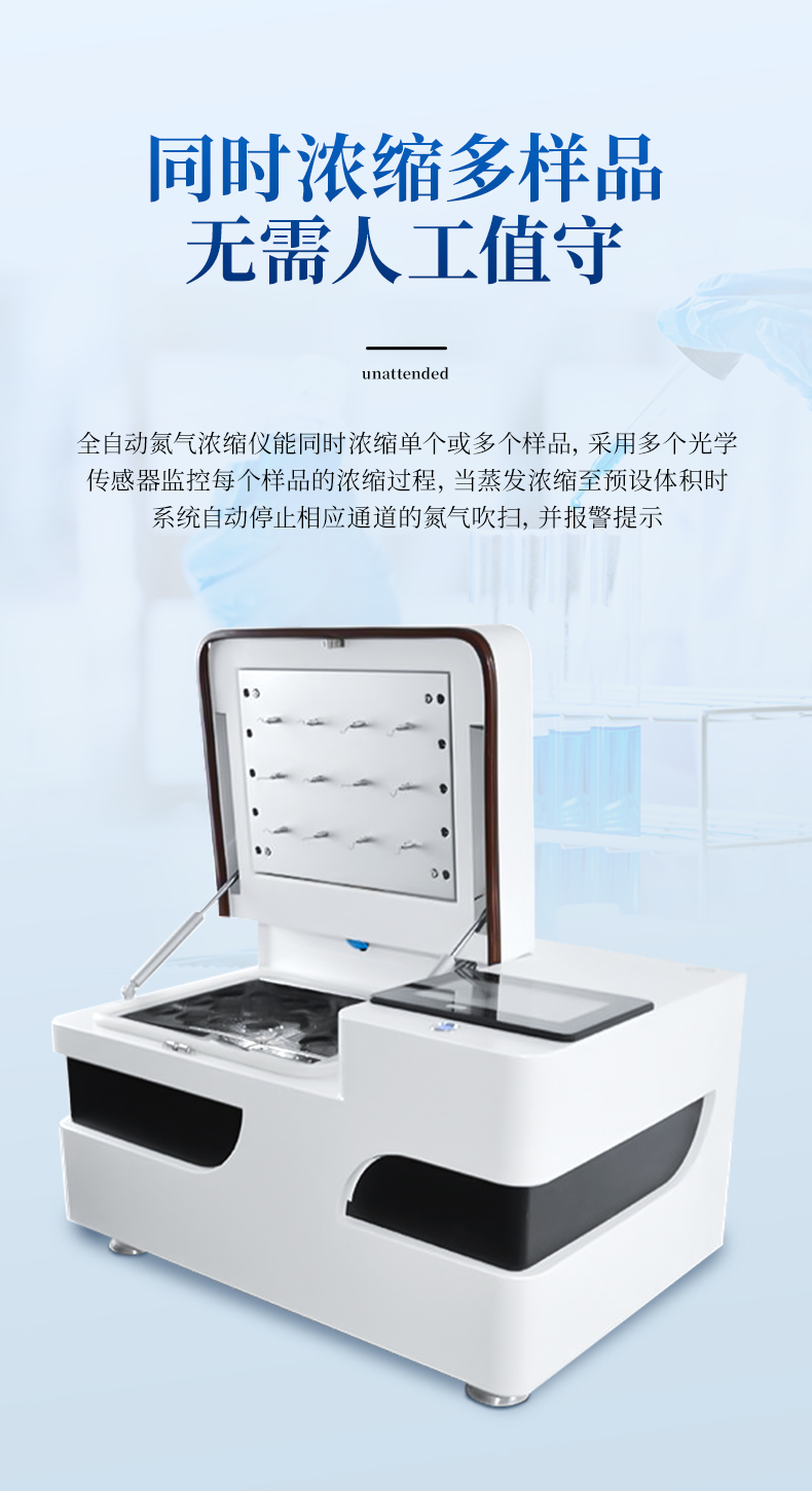 全自動(dòng)氮?dú)鉂饪s儀在大量的分析工作尤其是在環(huán)境污染物、食品安全分析領(lǐng)域中,為了獲得痕量的目標(biāo)組分,都需對(duì)備檢樣品進(jìn)行預(yù)處理,其過程主要包括有樣品提取(萃取)、濃縮、凈化及再濃縮等基本步驟,其中如何快速無損的濃縮也是關(guān)鍵的一環(huán)。完成濃縮過程的常用裝置包括旋轉(zhuǎn)蒸發(fā)儀、K-D濃縮器和氮?dú)獯祾撸ê?jiǎn)稱氮吹儀)等,其中以氮吹濃縮簡(jiǎn)單,它不需要特別的裝置設(shè)計(jì),當(dāng)樣品數(shù)量不多或溶劑量較小時(shí),采用該法方便。當(dāng)同時(shí)需要濃縮大批量樣品且溶劑量多時(shí),以上各濃縮裝置就顯得力不從心,濃縮過程顯得費(fèi)時(shí)、費(fèi)力(需要看管,以防吹干)且開放式的氮吹裝置對(duì)操作人員身體健康不利。