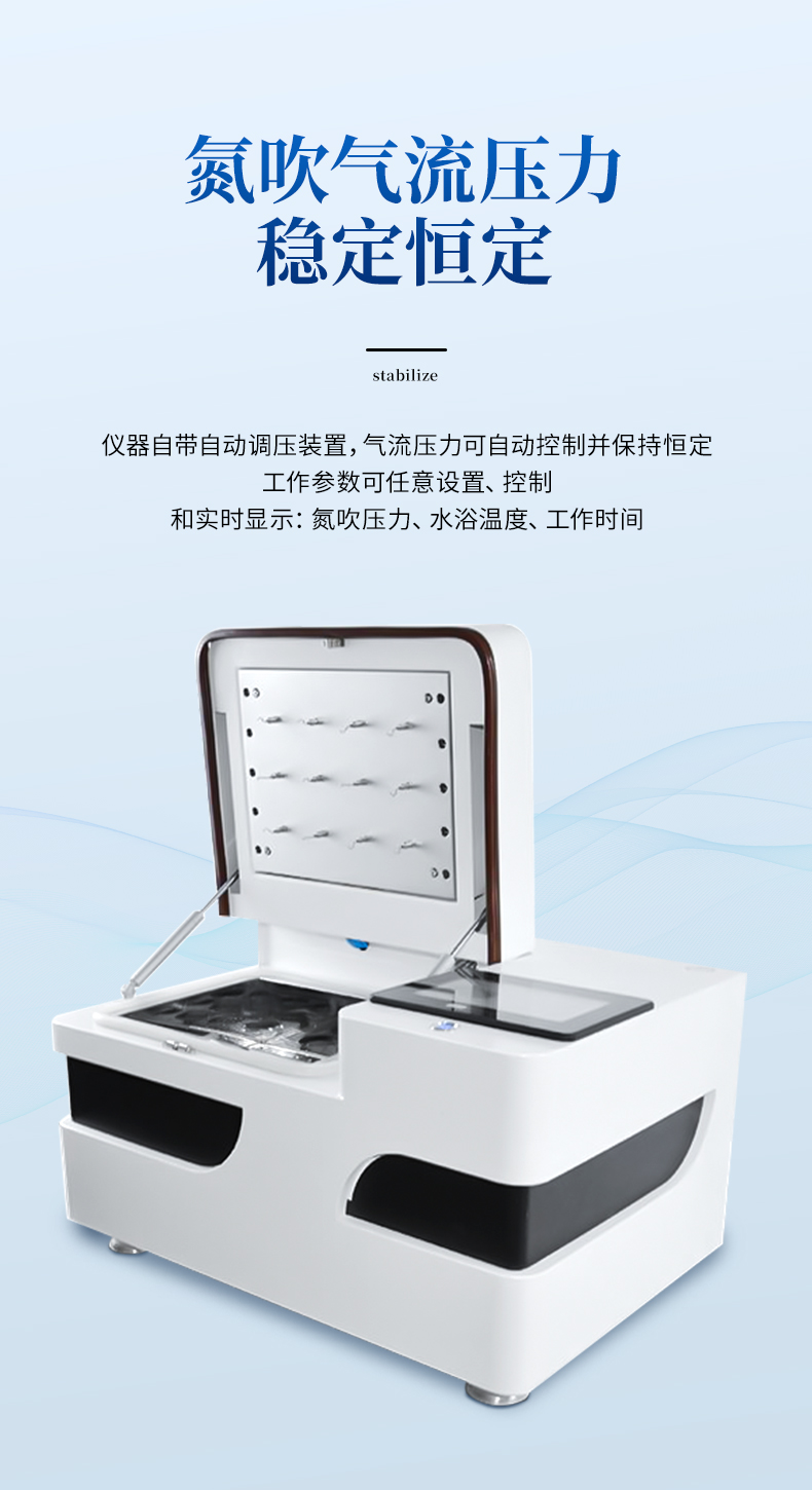 4、氮吹氣流壓力穩(wěn)定、恒定:儀器自帶自動(dòng)調(diào)壓裝置,氣流壓力可自動(dòng)控制并保持恒定,不受工作通道(樣品)突然開啟、關(guān)閉或數(shù)量的影響;